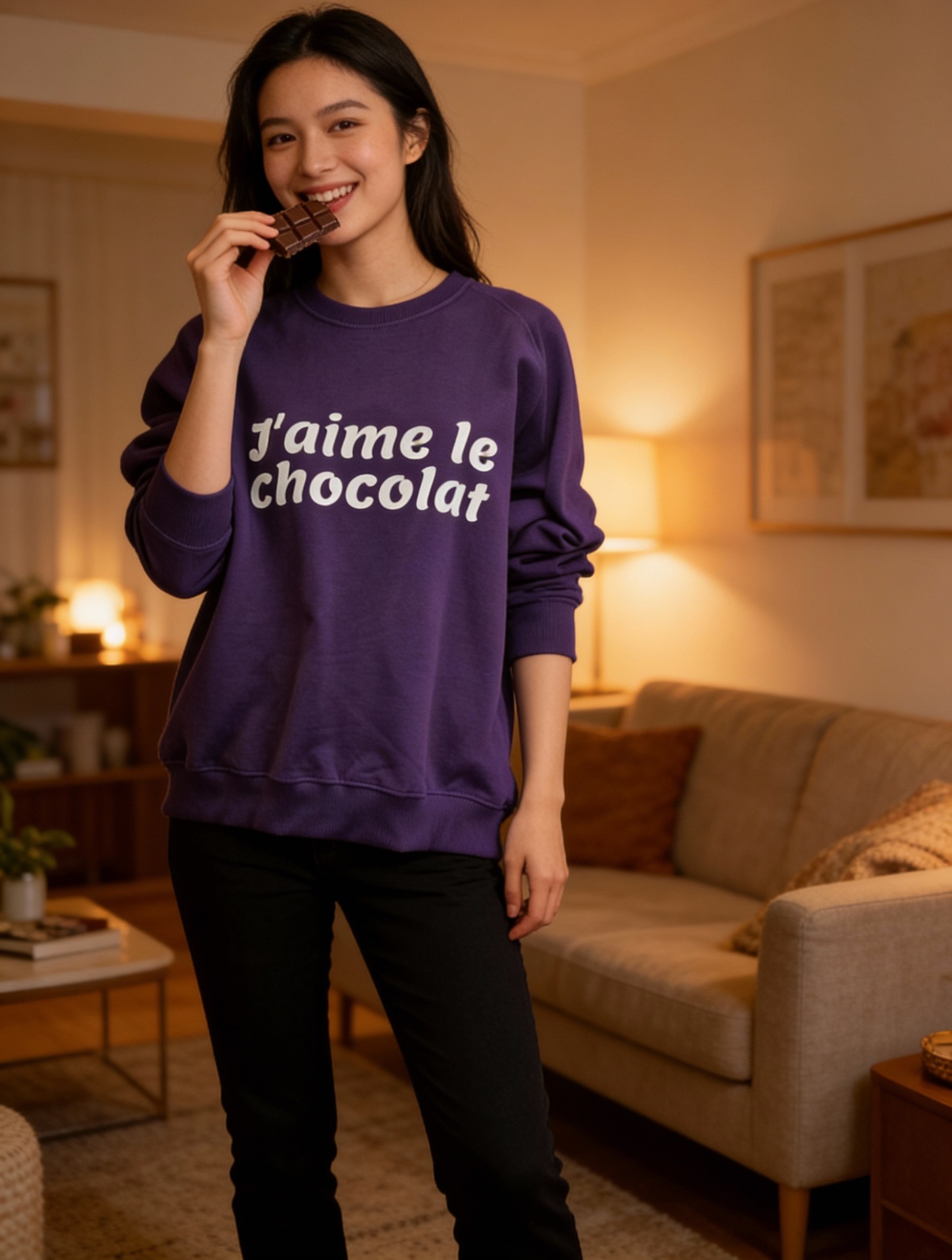 Sweater purper 'J'aime le chocolat' Maat: Large