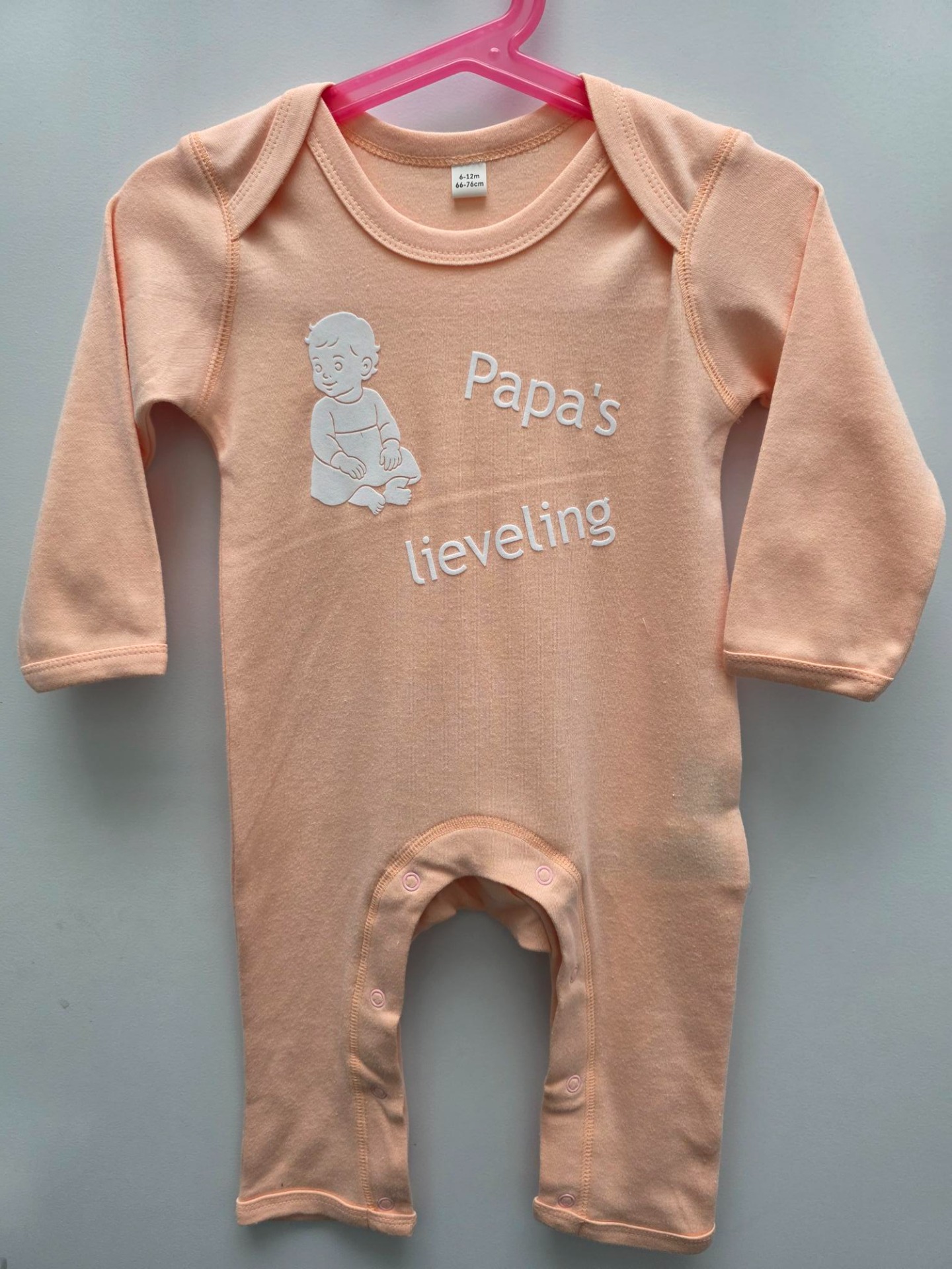 Zalmkleurige pyjama, 100% katoen met zelf ontworpen print. Uniek stuk.