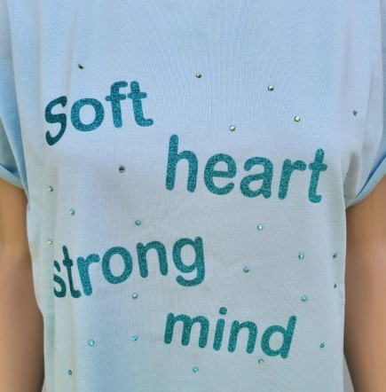 Lichtblauw-groen kleed met groene glitter print en strass. Soft hart, strong mind