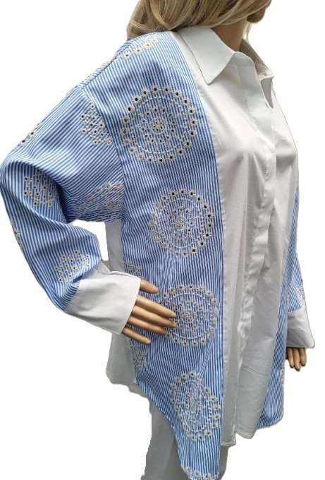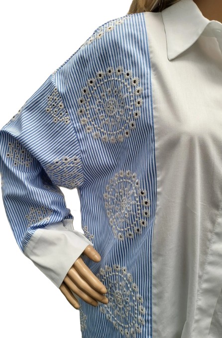 Oversized blouse blauw-wit met mooi borduursel. One size