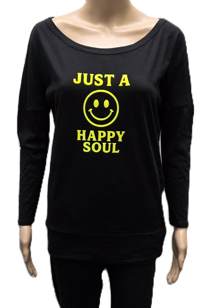 Zwart t-shirt met lange mouwen, boothals. Fluo flockprint