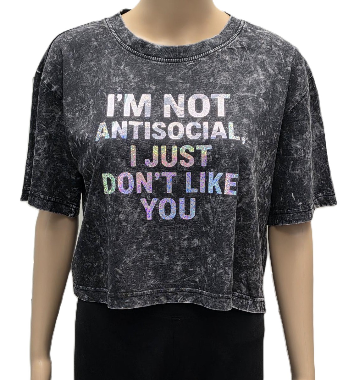 Grijs-zwart t shirt cropped 'I'm not antisocial, I just don't like you maat: medium