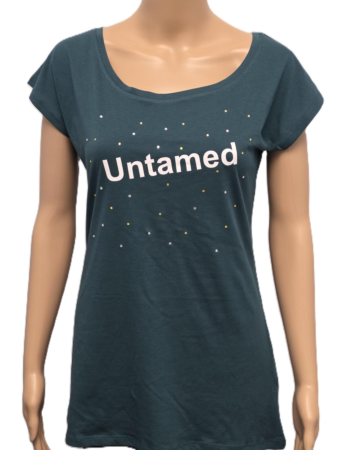 Groen t shirt. Met witte flockprint en strass steentjes. Maat: S