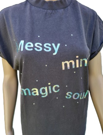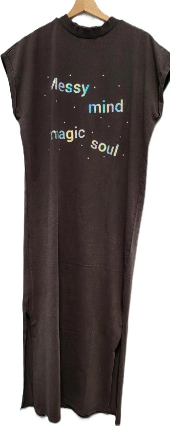 Lang kleed met split aan beide kanten , strass steentjes en zilver print : Messy mind magic soul