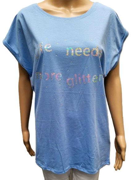 T shirt lichtblauw met print en strass. Life needs more glitter