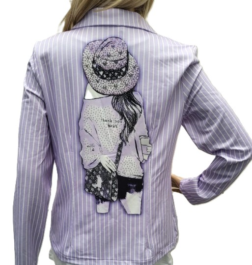 Stretch blazer mauve met witte streep. Leuke tekening met strass op de rug. Verschillende maten