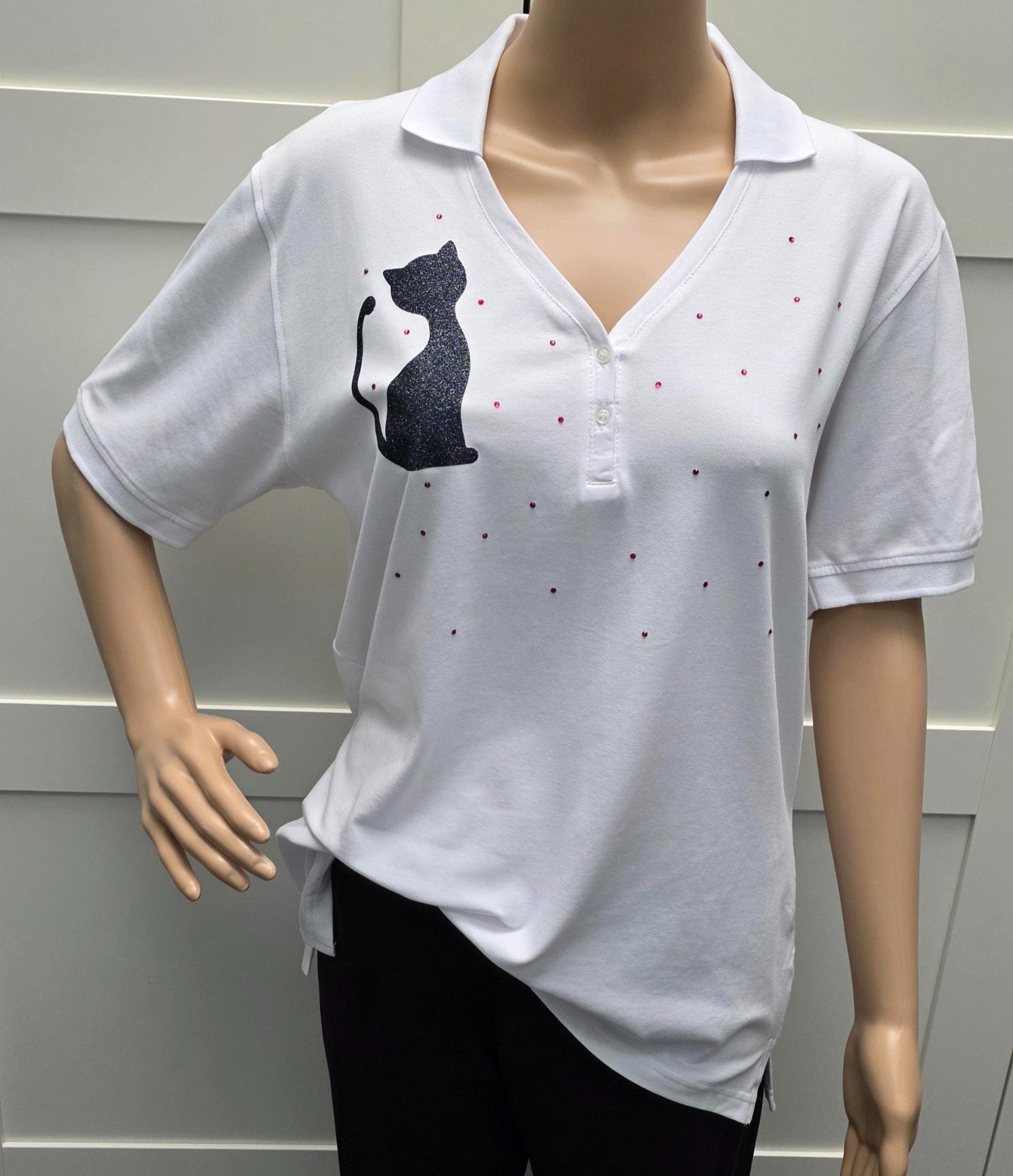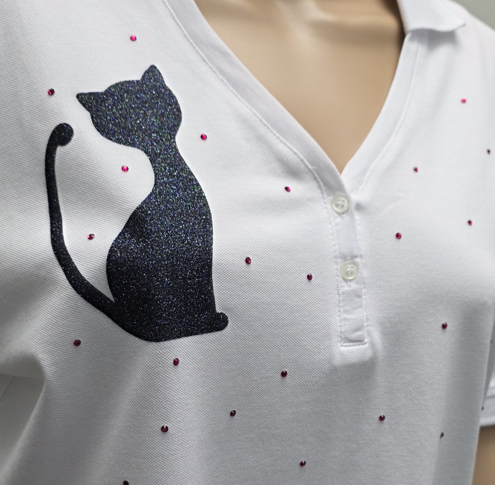 Witte polo shirt met zwarte glitterprint kat en rode strass.