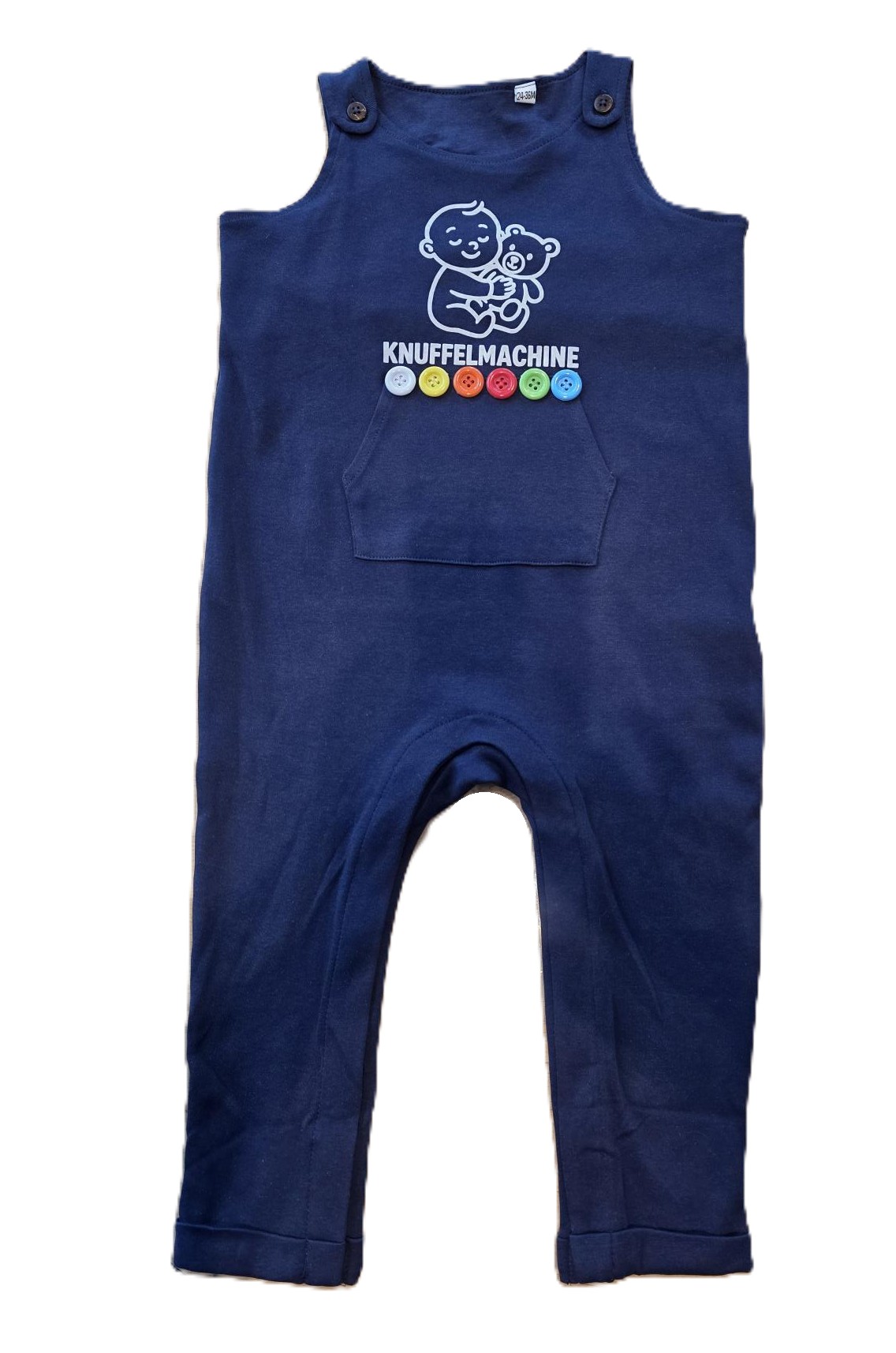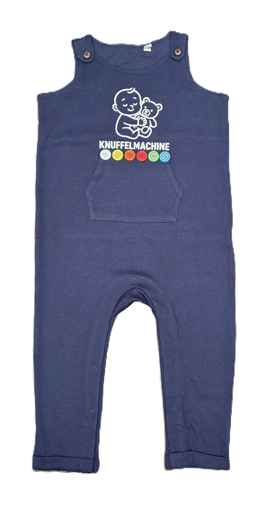 Blauwe salopette met witte flockprint en kleurige knopen