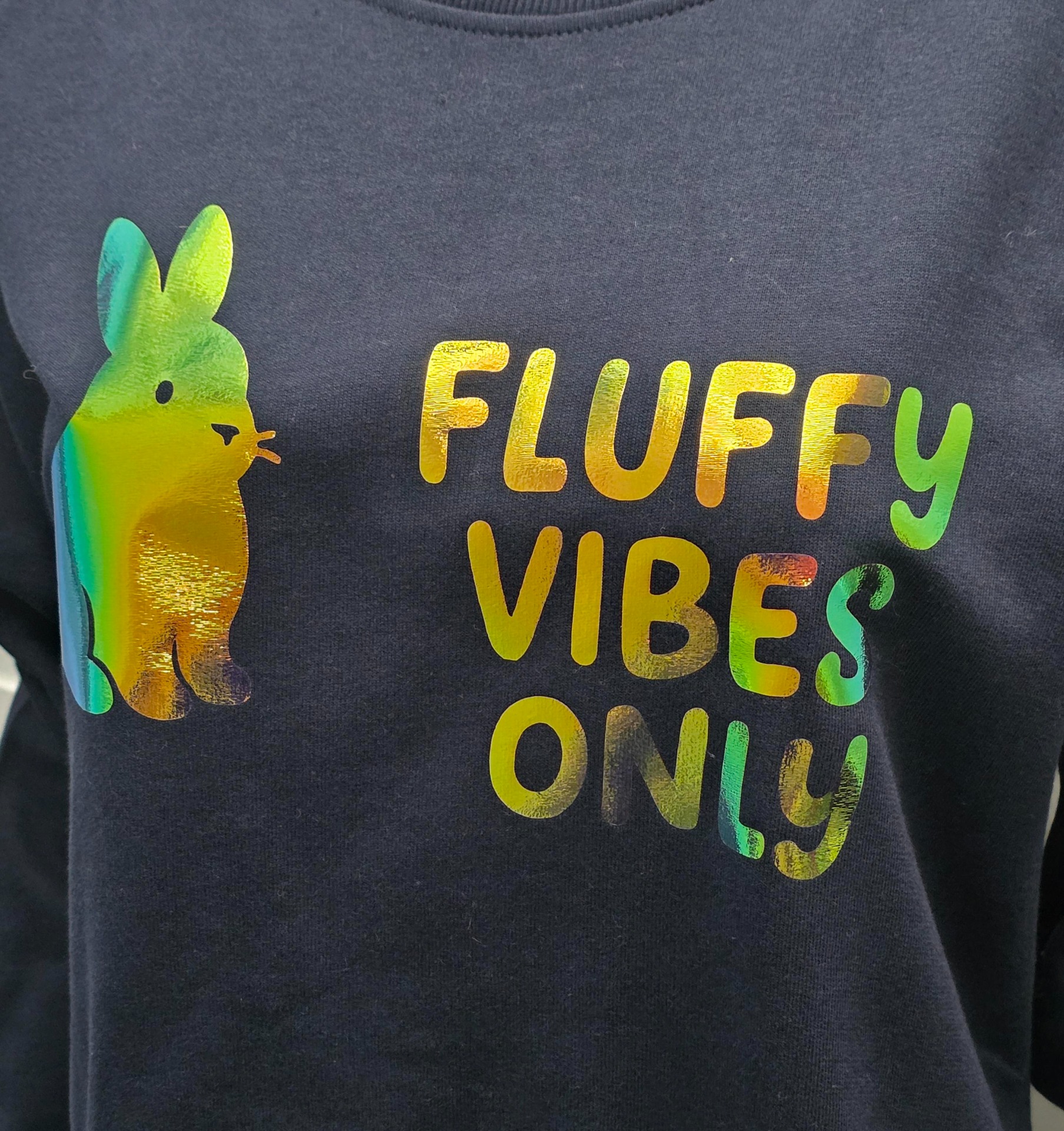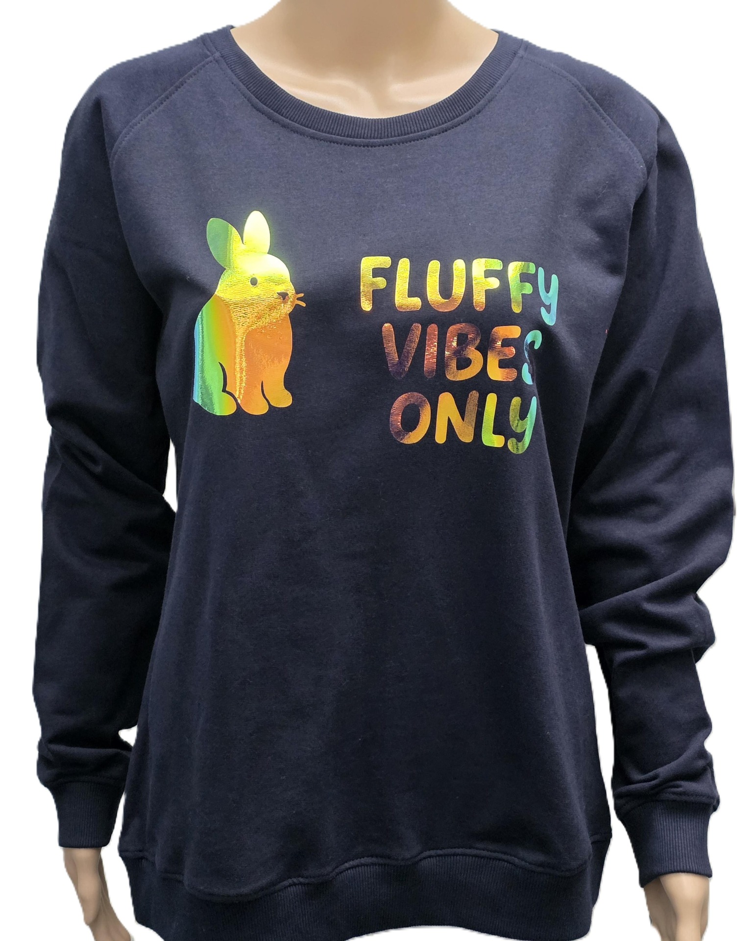 Sweater donkerblauw met effectprint. Fluffy vibes only