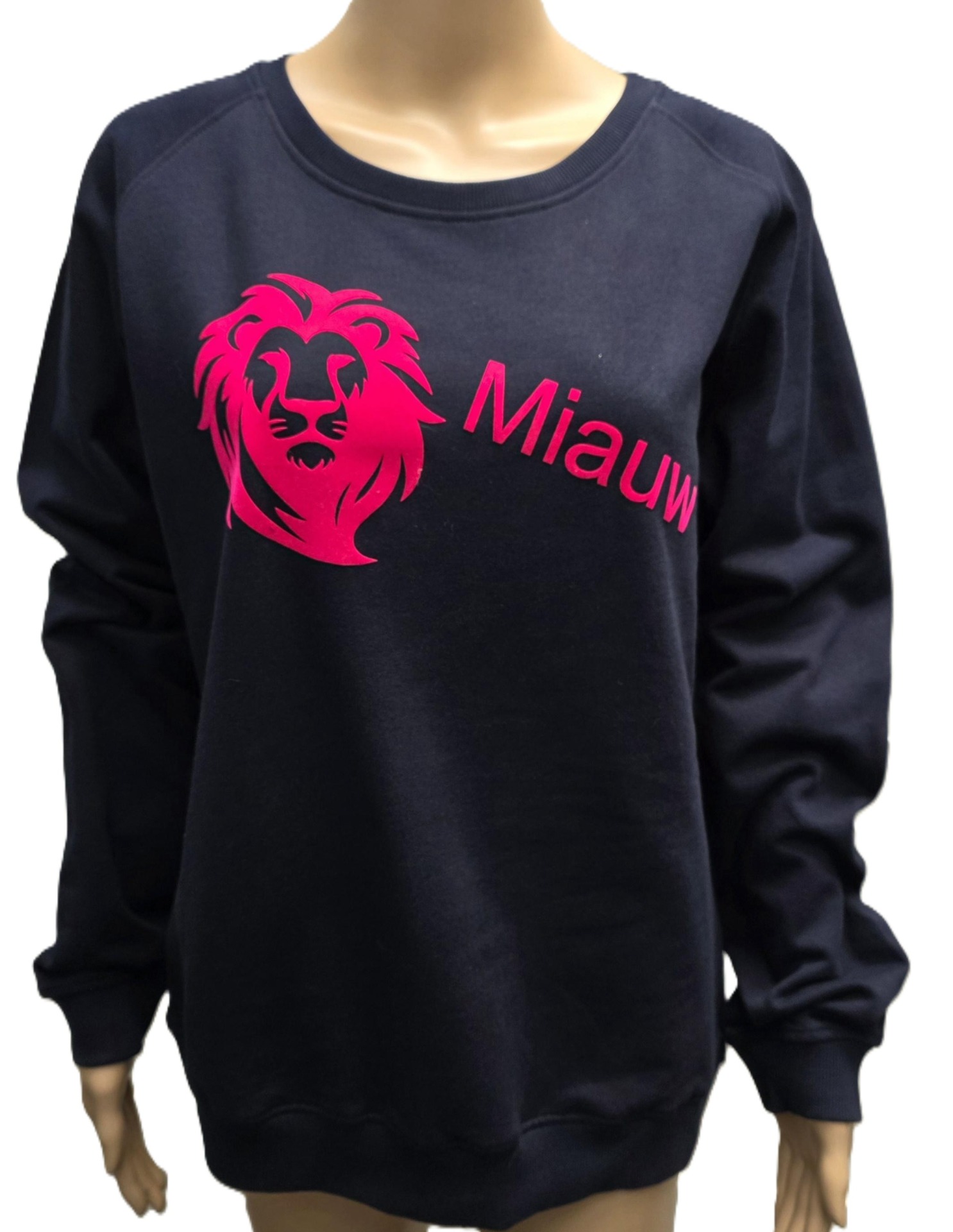 Sweater donkerblauw met fluoroze flockprint.