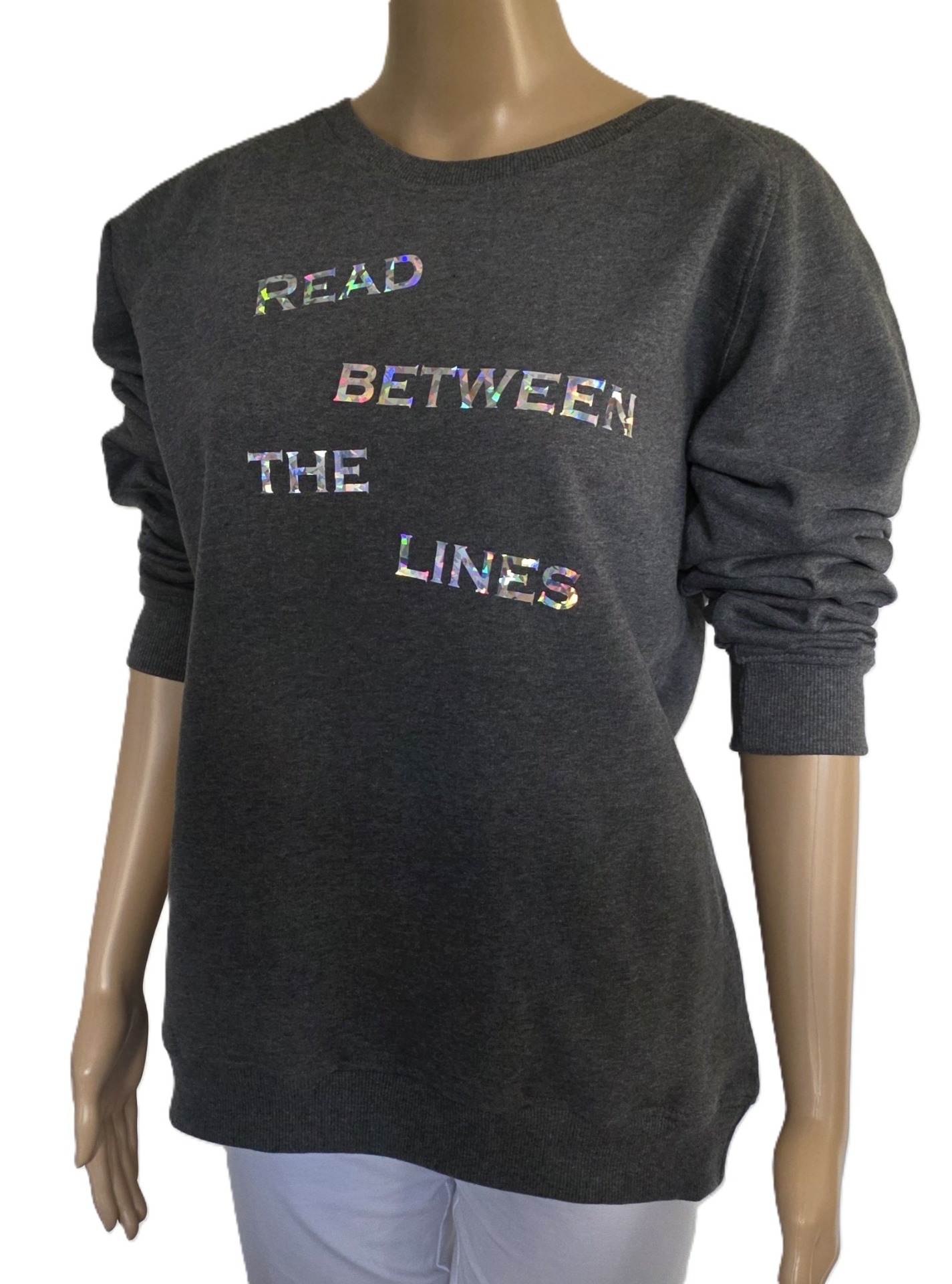 Sweater grijs met zilverprint. Uniek design. 'Read between the lines'