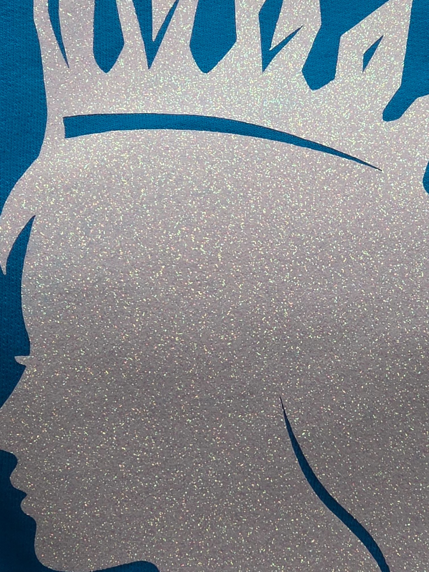 Leuke luchtige turqoise sweater met kap , met zilver glitterprint van ijskoningin