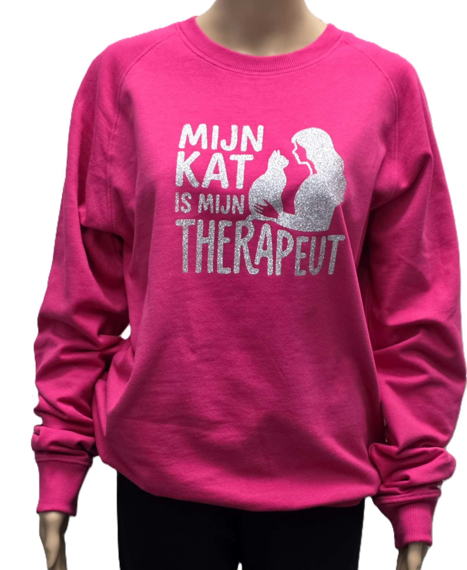 Sweater, fuchsia met zilver glitter print. Mijn kat is mijn therapeutMaat: medium
