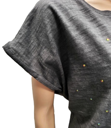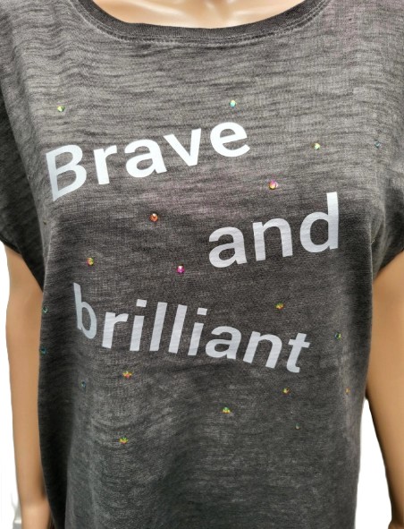 T shirt donkergrijs (spray dye) met print en strass. Brave and brilliant