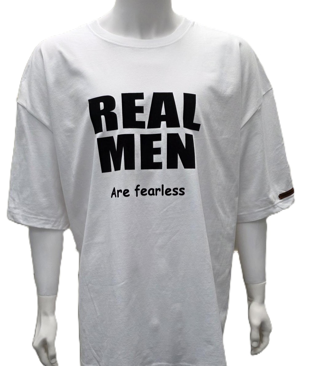 Wit T shirt REAL MEN 'Are fearless' met zwarte flockprint