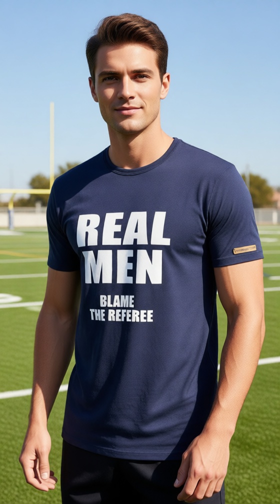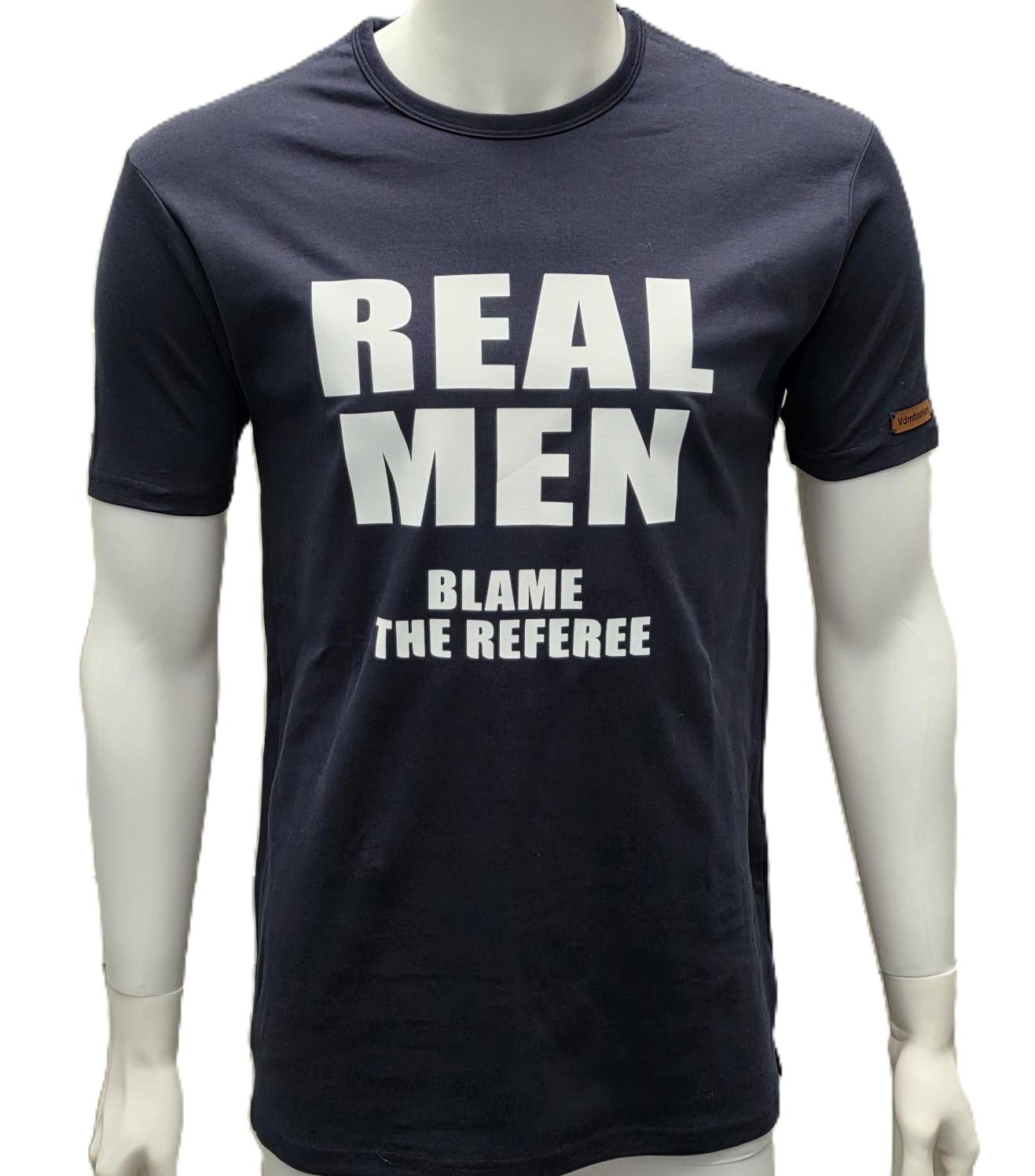 Donkerblauw T shirt REAL MEN 'Blame the referee' met witte print