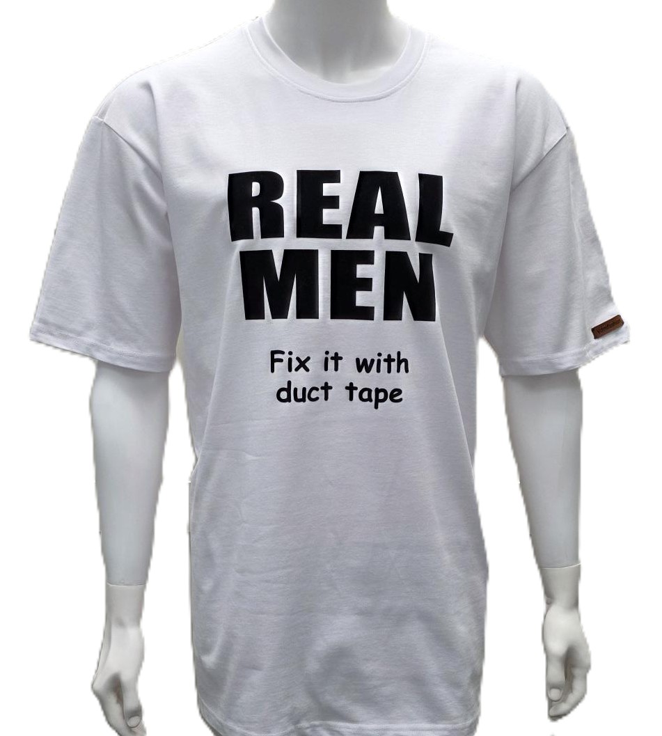 Wit T shirt REAL MEN 'Fix it with duct tape' met zwarte flockprint