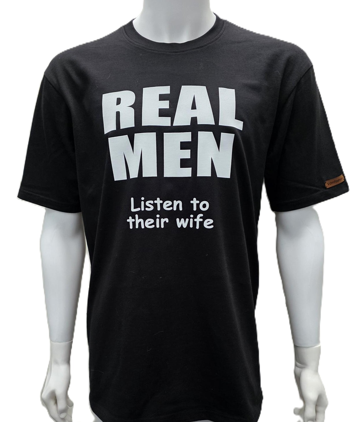Zwart T shirt REAL MEN 'Listen to their wife' met witte flockprint