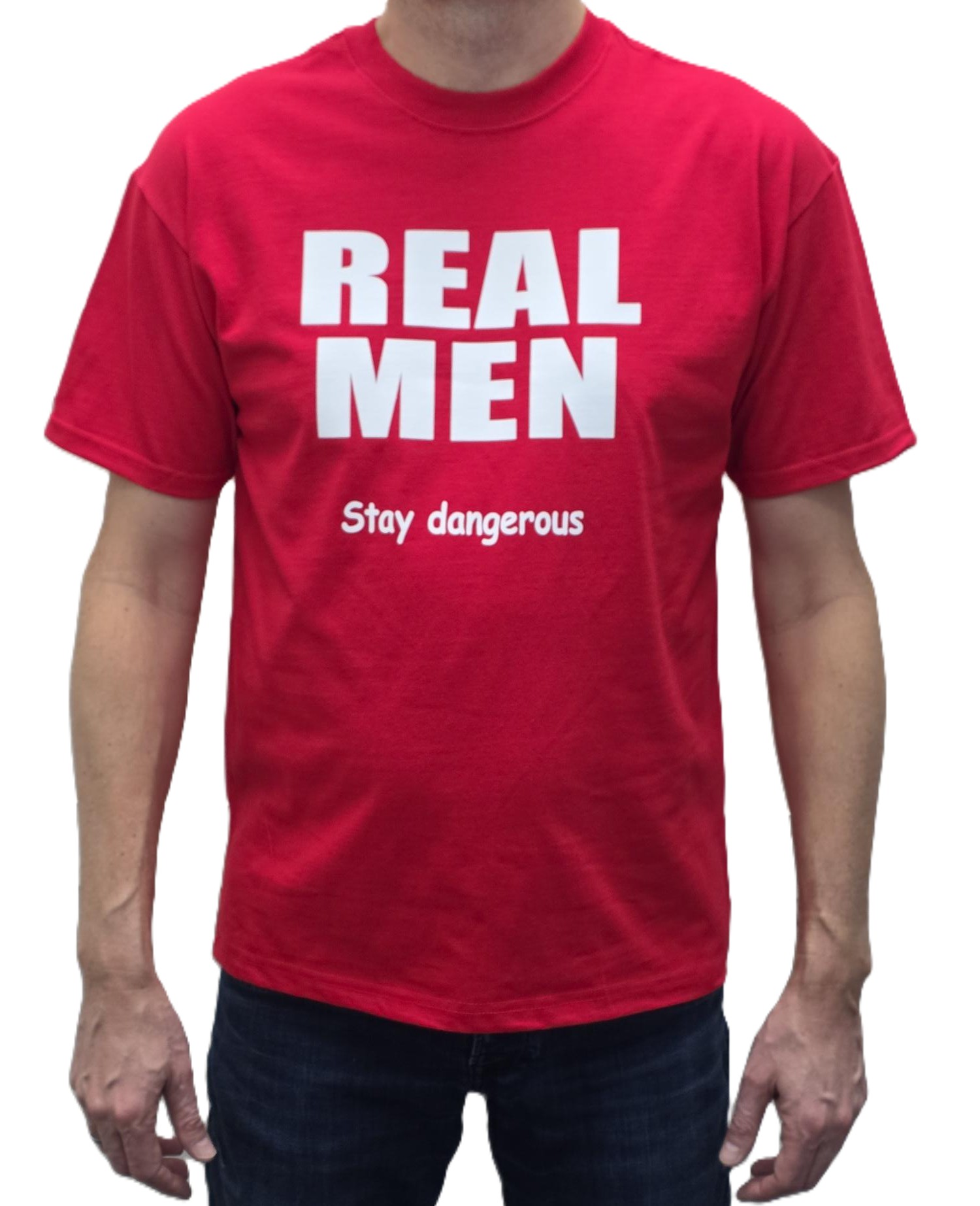 Rood T shirt REAL MEN 'Stay dangerous' met witte flockprint