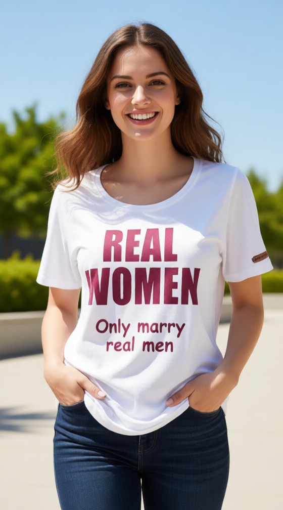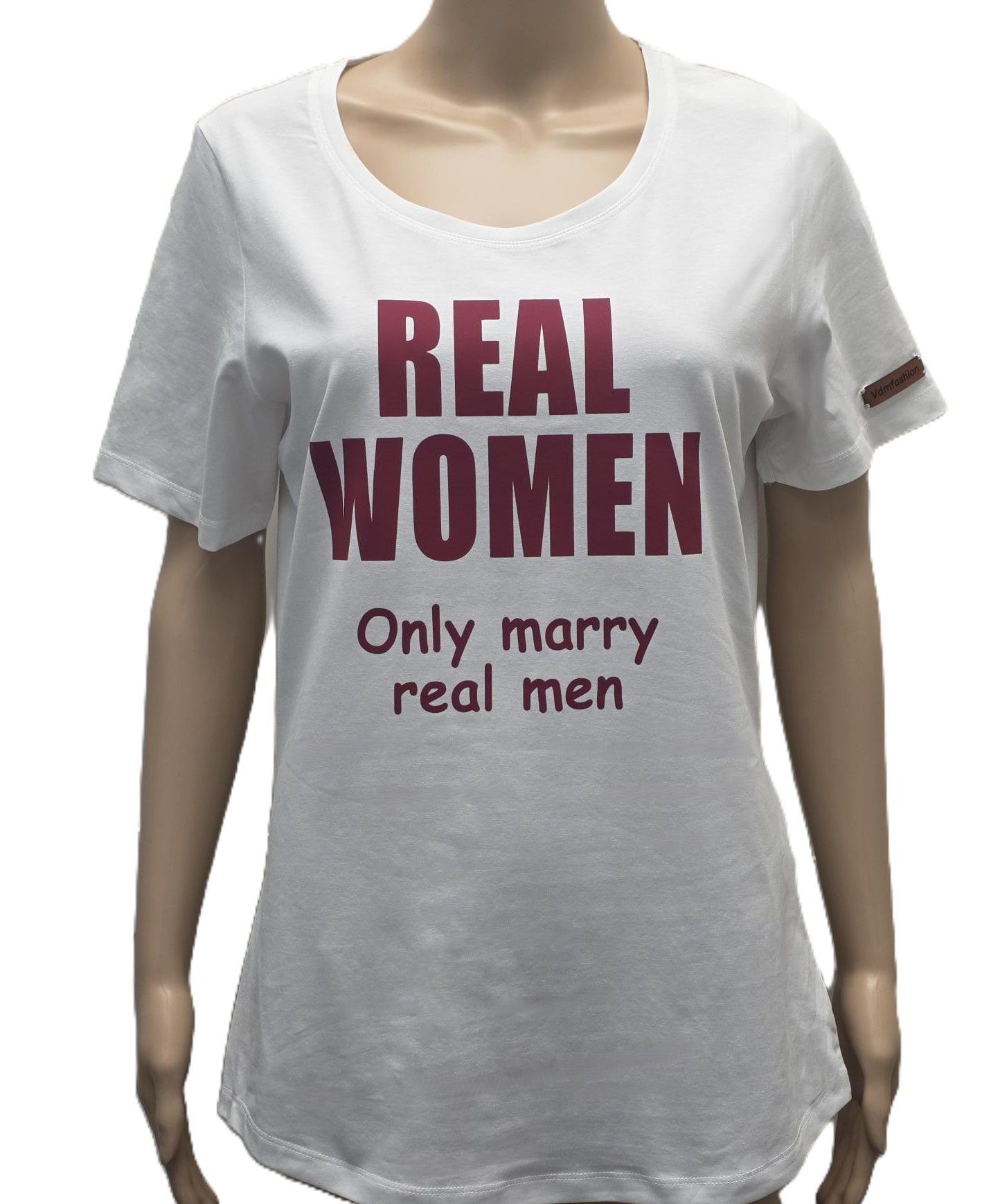 Wit T shirt REAL WOMEN 'Only marry real men' met bordeaux print