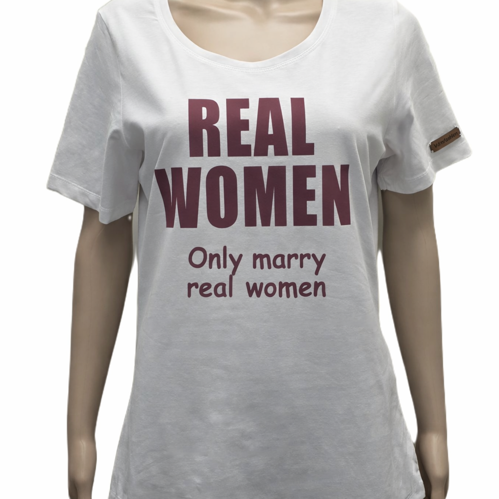 Wit T shirt REAL WOMEN 'Only marry real women' met bordeaux print