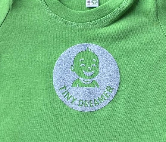 Groen t shirt met lange mouwen en glitterprint, 100% katoen met zelf ontworpen print. Uniek stuk.