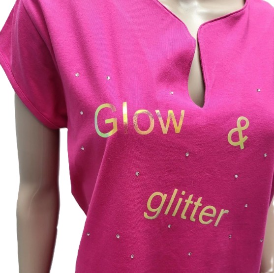 Fuchsia T shirt met glitterprint. Glow and glitter