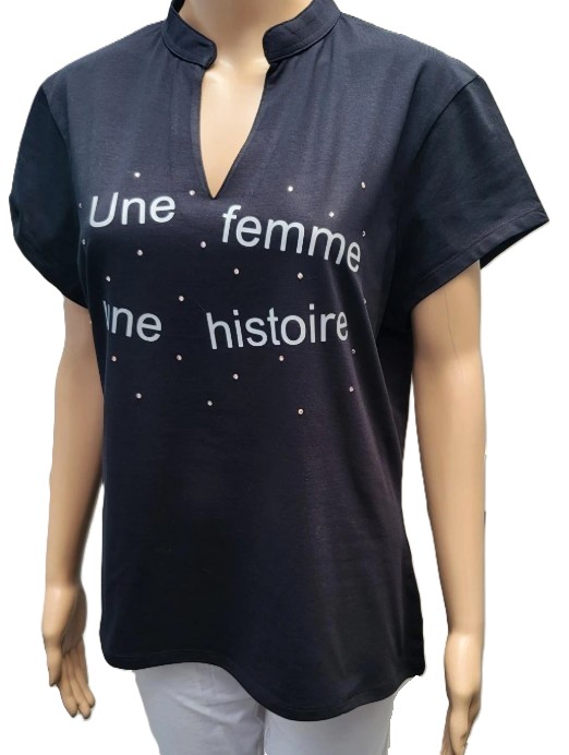 Zwart T shirt met zilver glitterprint. Une femme, une histoire.