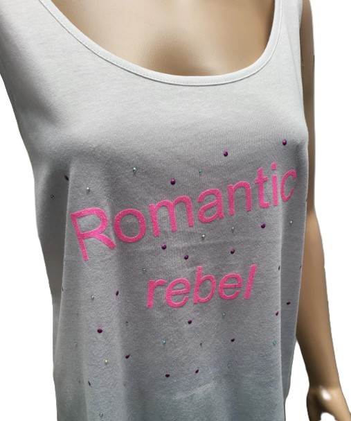 Witte top met roze glitterprint en strass. Romantic rebel