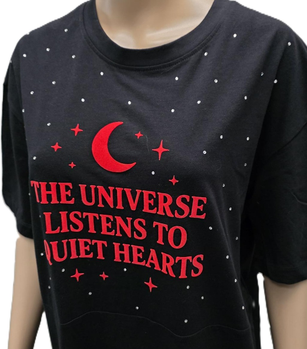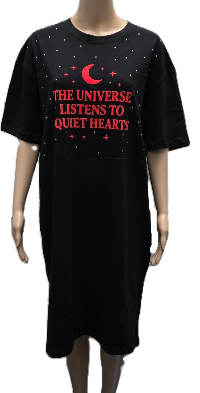 Zwart oversized kleed met kleine split onderaan links en rechts en rode flockprint en strasssteentjes